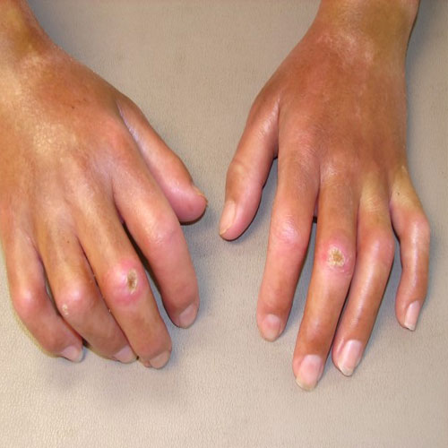 - انگشتان دست و پا: پدیده رینود ناشی از اسکلرودرمی سیستمیک پوستی محدود است. در این شرایط رگهای خونی کوچک در انگشتان دست و پا در پاسخ به دمای سرد یا برخی احساسات شروع به منقبض شدن یا کوچک شدن میکنند. در نتیجه، انگشتان دست و پا ممکن است دردناک شوند، آبی شوند یا بیحس شوند.